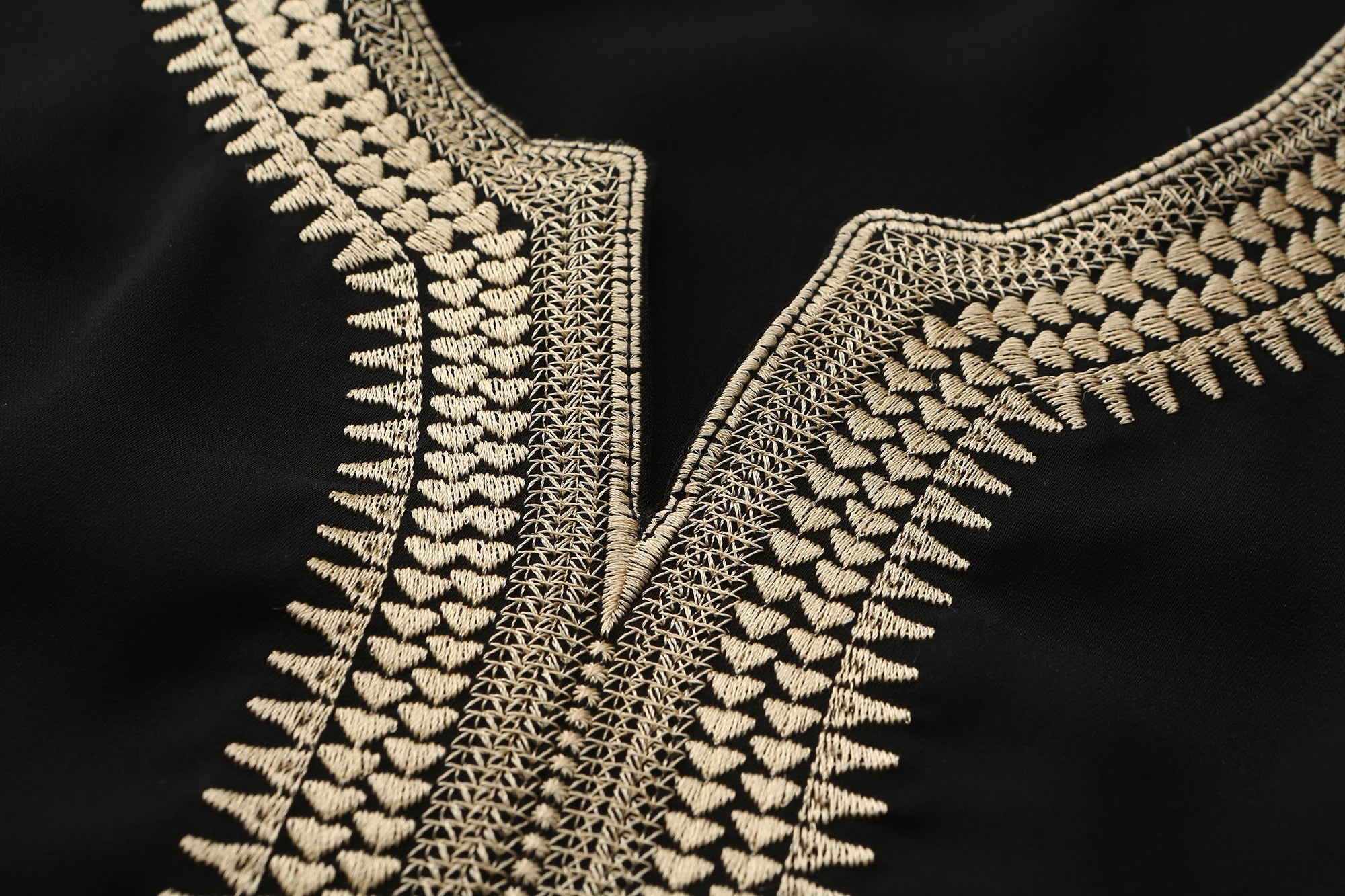 هذا الثوب الأسود ذو الطراز المغربي يتميز بتطريزاته الذهبية الدقيقة ومظهره الرائع. تصميمه الواسع يضمن حرية حركة كبيرة، مع الحفاظ على قوام أنيق. مثالي للاحتفالات، الصلوات أو الخروج بشكل أنيق.