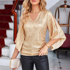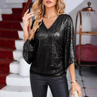 Tato blůza zvýrazňuje siluetu svým rafinovaným výstřihem do V a volnými rukávy s elegantním spadením. Třpytivé flitry dodávají vašemu vzhledu jemný glamour. Ideální pro večery nebo speciální příležitosti, spojuje sofistikovaný styl s naprostým komfortem.