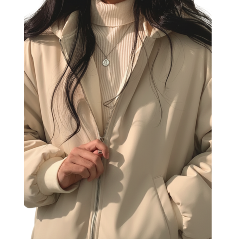 Tato bunda se vyznačuje svou reverzibilní konstrukcí, která nabízí světle šedou stranu s hladkým vizuálním vzhledem a krémovou stranu s objemnějším vzhledem. Každá strana nabízí jiný vzhled: jedna pro střídmý styl, druhá pro více obepínající a texturovaný vzhled. Její krátký střih, integrovaná kapuce a velkorysý objem z ní činí ideální kousek na chladné dny, kdy chcete variabilitu ve svém outfitu bez změny oblečení.