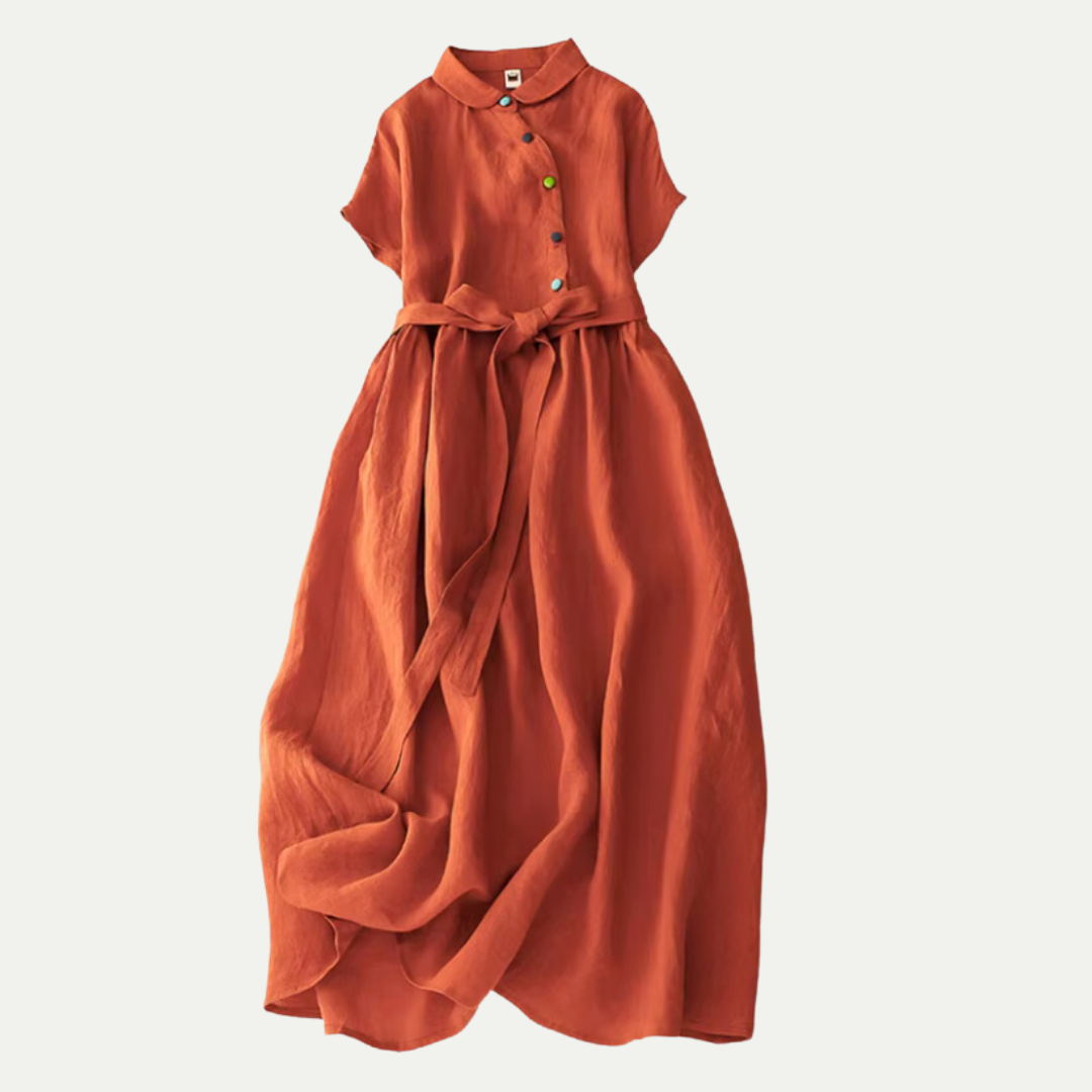 Αυτή η μακριά φόρεμα γοητεύει με τη κολακευτική της σιλουέτα και το σχέδιο εμπνευσμένο από το vintage στυλ. Άνετη και αναπνεύσιμη, φοριέται εύκολα σε όλες τις εποχές. Τα λεπτά κουμπιά και οι προσεγμένες λεπτομέρειες της προσδίδουν μια αίσθηση διαχρονικής γοητείας, αντάξια ενός μυθιστορήματος εποχής.
