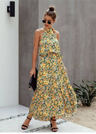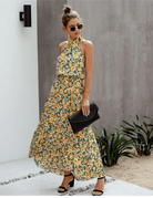 This long bohemian dress captivates with its vibrant floral print and its refined tie around the neck. Its fluid cut subtly enhances the silhouette while providing ideal comfort for hot days. Perfect for a summer getaway or a stroll in the city.