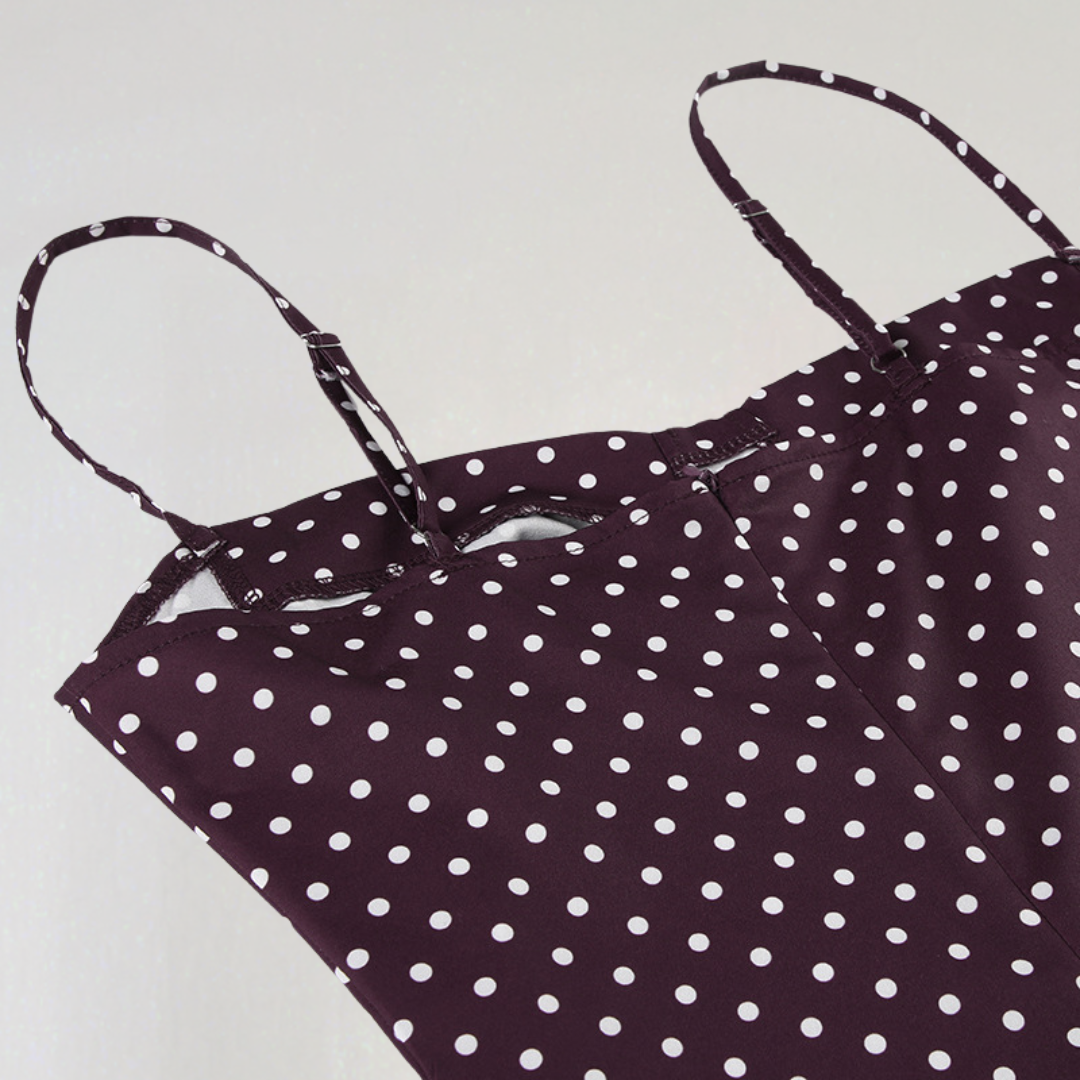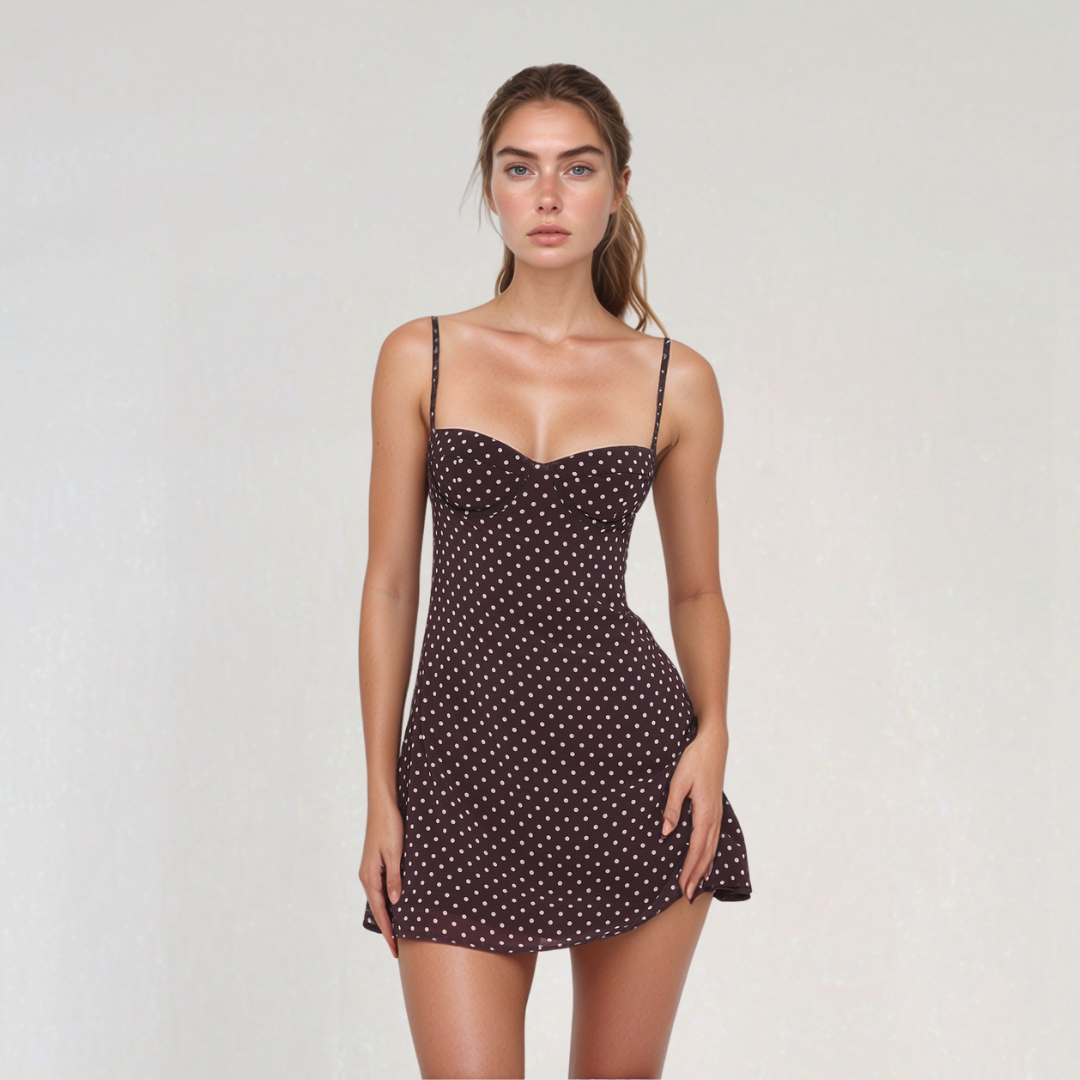 Cette robe courte séduit par sa coupe féminine, ses fines bretelles et son décolleté en cœur. Le motif à pois sur fond chocolat lui donne une allure rétro et élégante. Idéale pour rayonner lors des journées ensoleillées ou des soirées d'été.