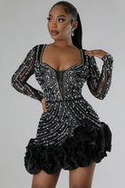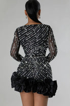 このミニタイトドレスは、きらめくクリスタルで飾られています。深いVネックとフィットした長袖が洗練されたシルエットを提供します。夜のお出かけや特別なイベントにぴったりです。