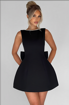 このノースリーブドレスは、背中の洗練されたリボンと、エレガンスを加える繊細なパールのディテールで魅了します。流れるようなシルエットと軽やかな生地は、特別な occasion や夜のお出かけにぴったりの装いです。複数の色で展開されており、あらゆるスタイルの好みに合わせることができます。