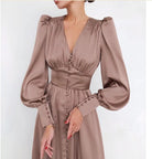 この光沢のある生地のエレガントなドレスは、流れるような洗練されたシルエットを描きます。夜のお出かけや特別なイベントに最適で、あなたのスタイルを最もよく反映するために複数のカラーで提供されています。