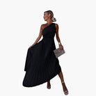 このシックなイブニングドレスは、ユニークな肩と洗練された非対称のカットで魅了します。体のラインを完璧に引き立て、素晴らしいシルエットを作り出します。最もエレガントなイベントで輝くための理想的なアイテムです。