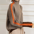 Deze pullover benadrukt een gestructureerde lijn dankzij het verfijnde chevronpatroon. De contrasterende banden langs de mouwen voegen een duidelijke visuele toets toe zonder over de top te zijn. De licht ruime snit maakt het gemakkelijk om dagelijkse of meer formele outfits samen te stellen.