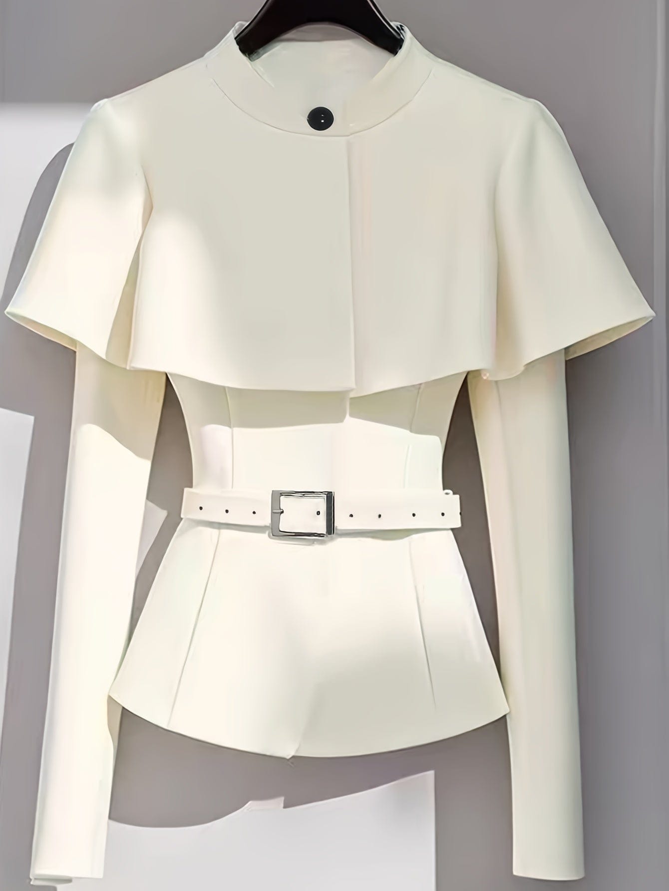 Ta zapinana peleryna podkreśla sylwetkę, nadając jej elegancki i nowoczesny wygląd. Jej strukturalny krój i regulowany pasek elegancko akcentują talię. Idealna na chłodne dni, dodaje szczyptę wyrafinowania do każdej stylizacji.