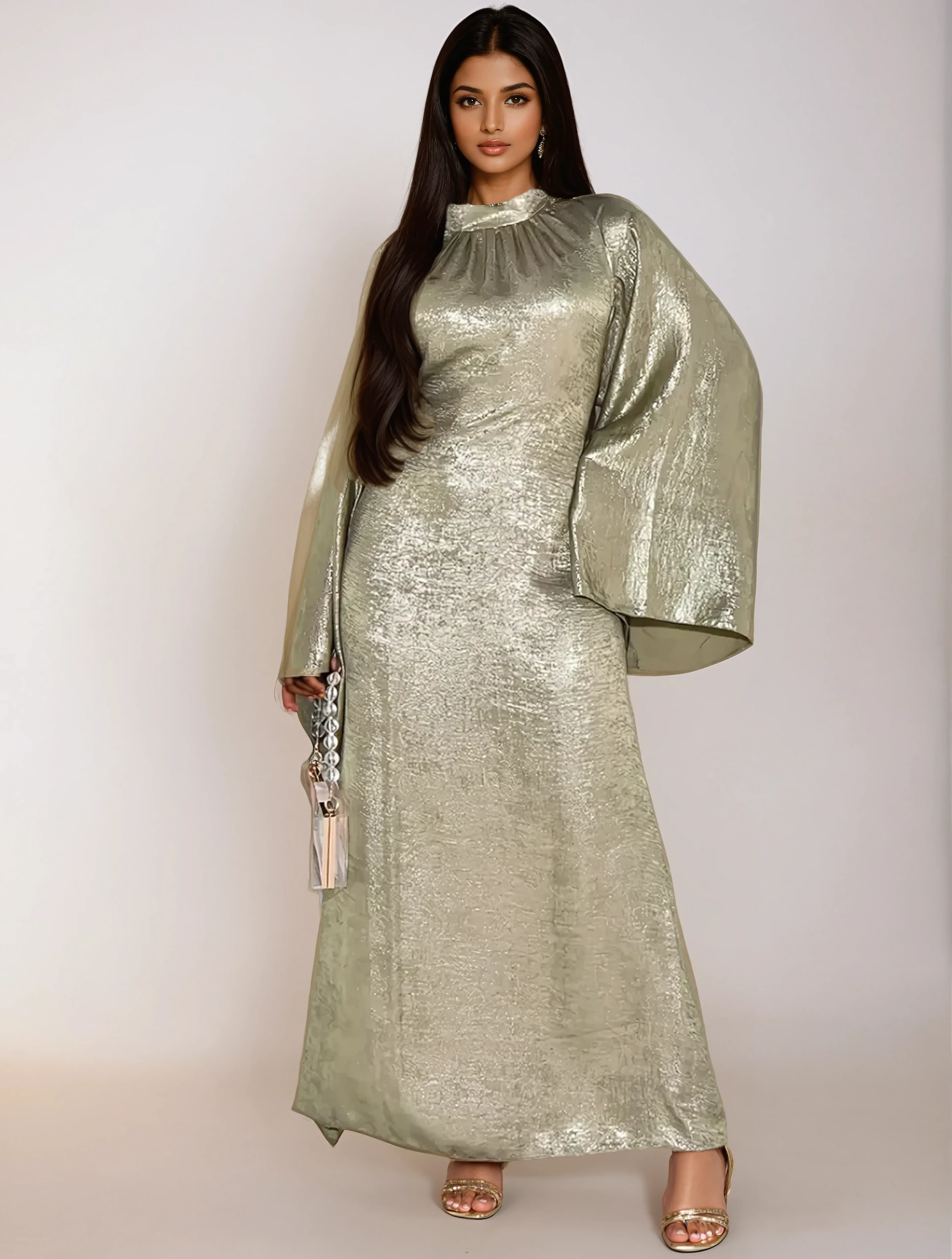 Zachwyć się eleganckim wyglądem w tej jasnej zielonej sukni abaya, która jest zarówno zwiewna, jak i nowoczesna. Jej długi krój, nieprzezroczysty materiał i delikatny kolor sprawiają, że jest to idealny wybór na Twoje specjalne wydarzenia, przyjęcia lub eleganckie wieczory.