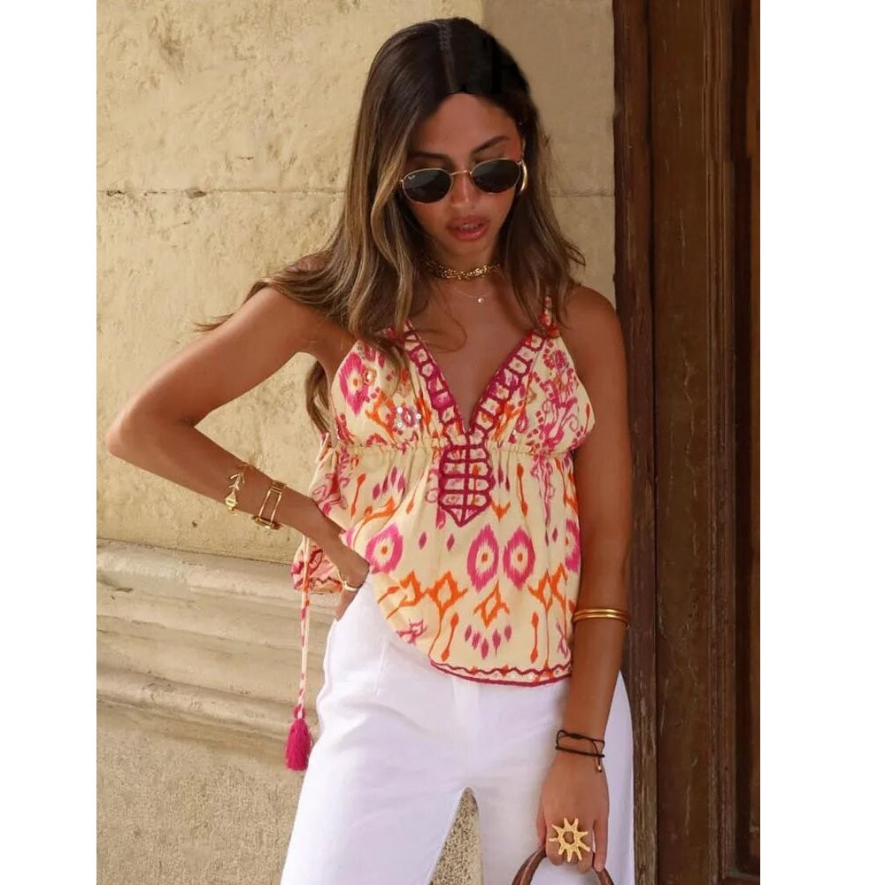 החולצה ללא שרוולים הזו מפתה עם הדוגמה המושפעת מהאמנות האצטקית וצבעיה הבוהקים. קלילה וזורמת, היא מושלמת לימים שטופי שמש, משלבת נוחות וסגנון נינוח.